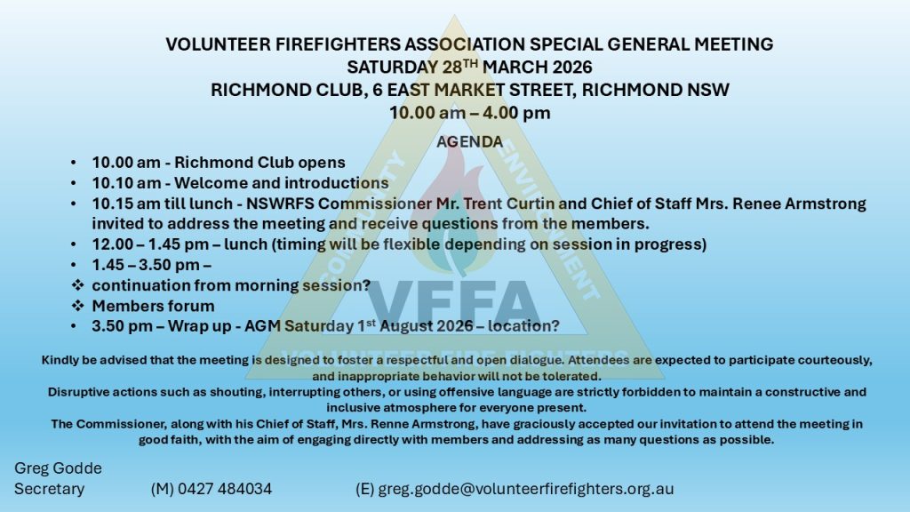 The Volunteer Firefighters Association of NSW (VFFA) will be holding a General Meeting for its members on Saturday, 28 March 2026. The meeting will take place at Club Richmond, located at 6 East Market Street, Richmond NSW. Proceedings will commence…